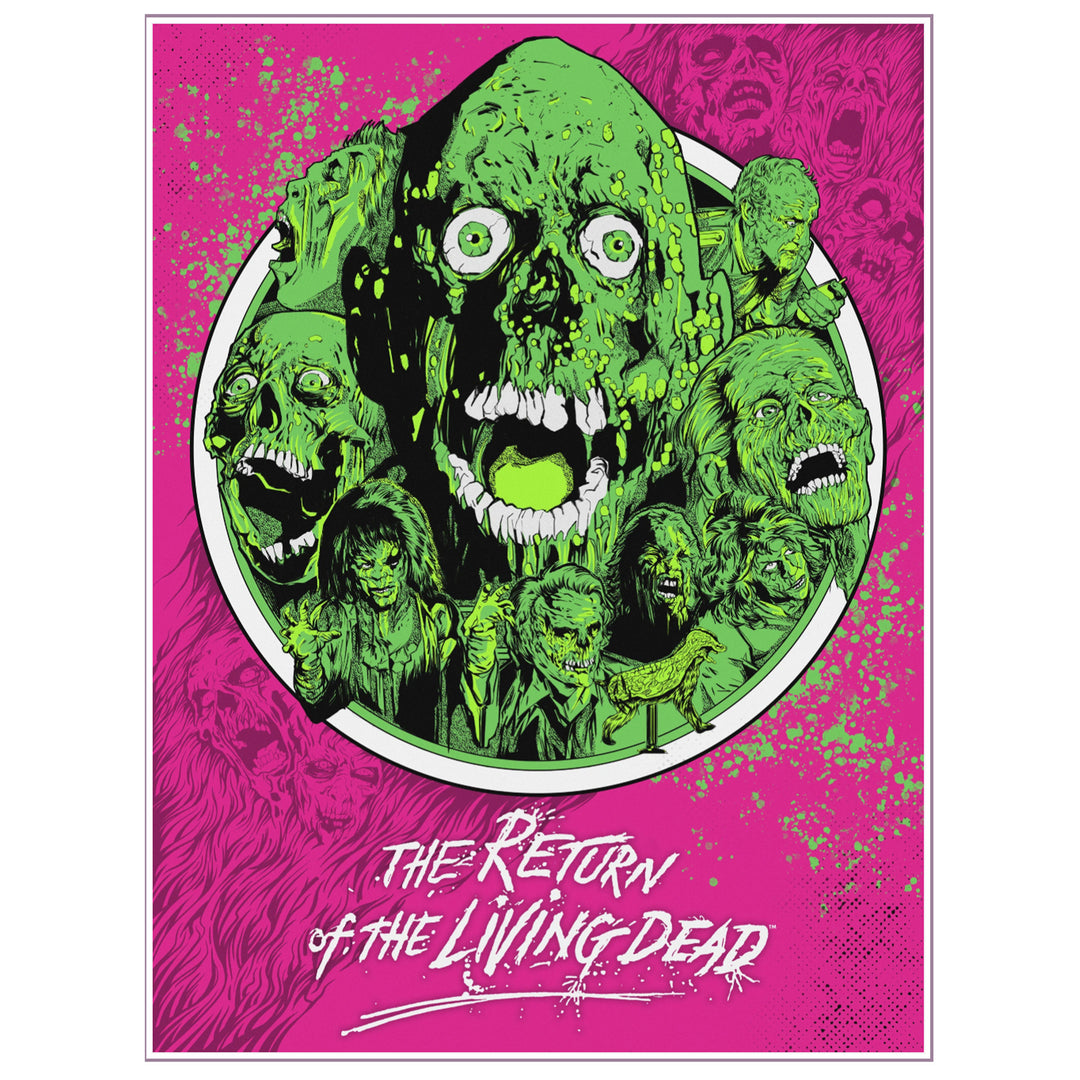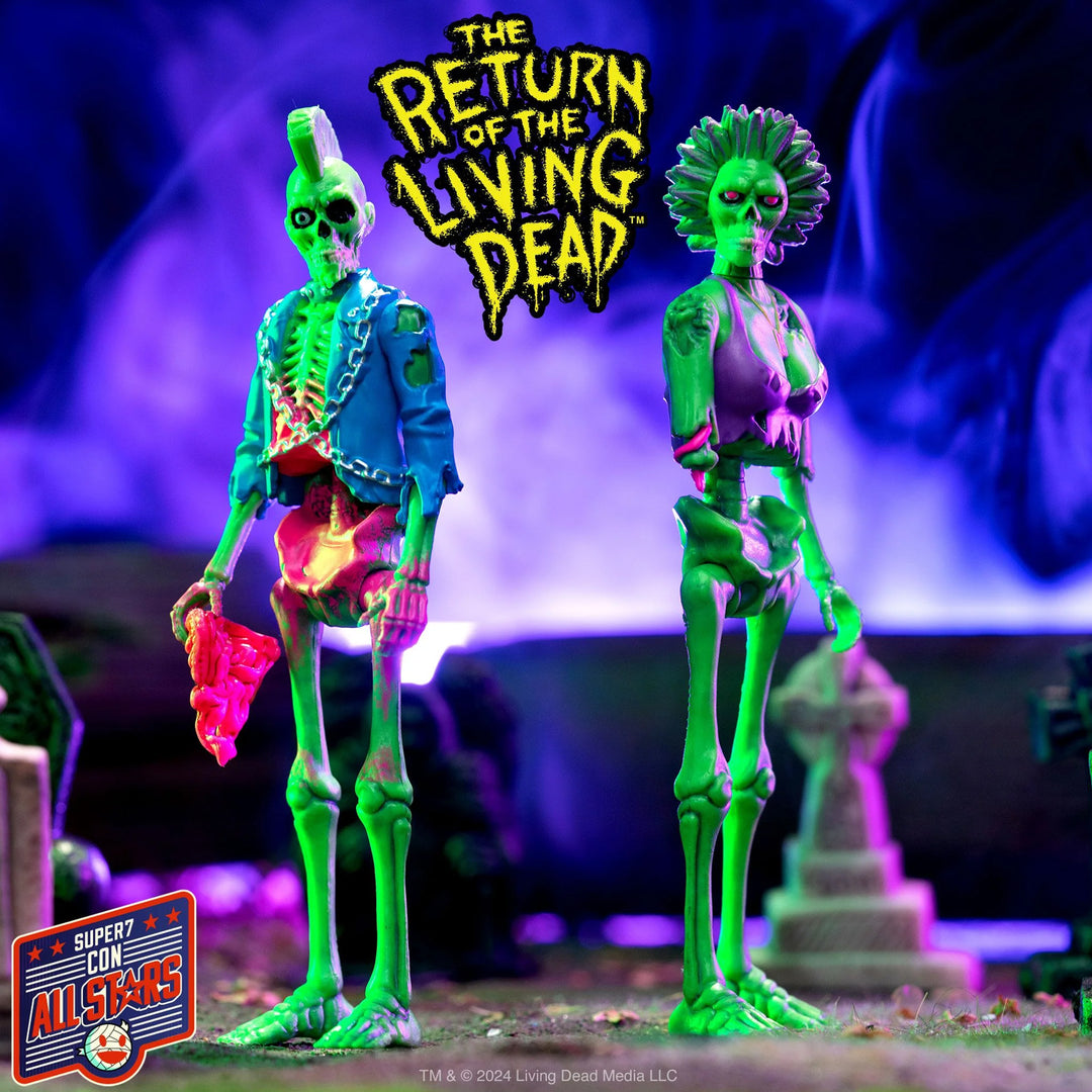 Return of the Living Dead ReAction Figures are 3.75” scale , packaged on flocked cardbacks with velvet-like texture just like vintage blacklight posters! These unearthly blacklight Return of the Living Dead ReAction Figure variants are a must have!